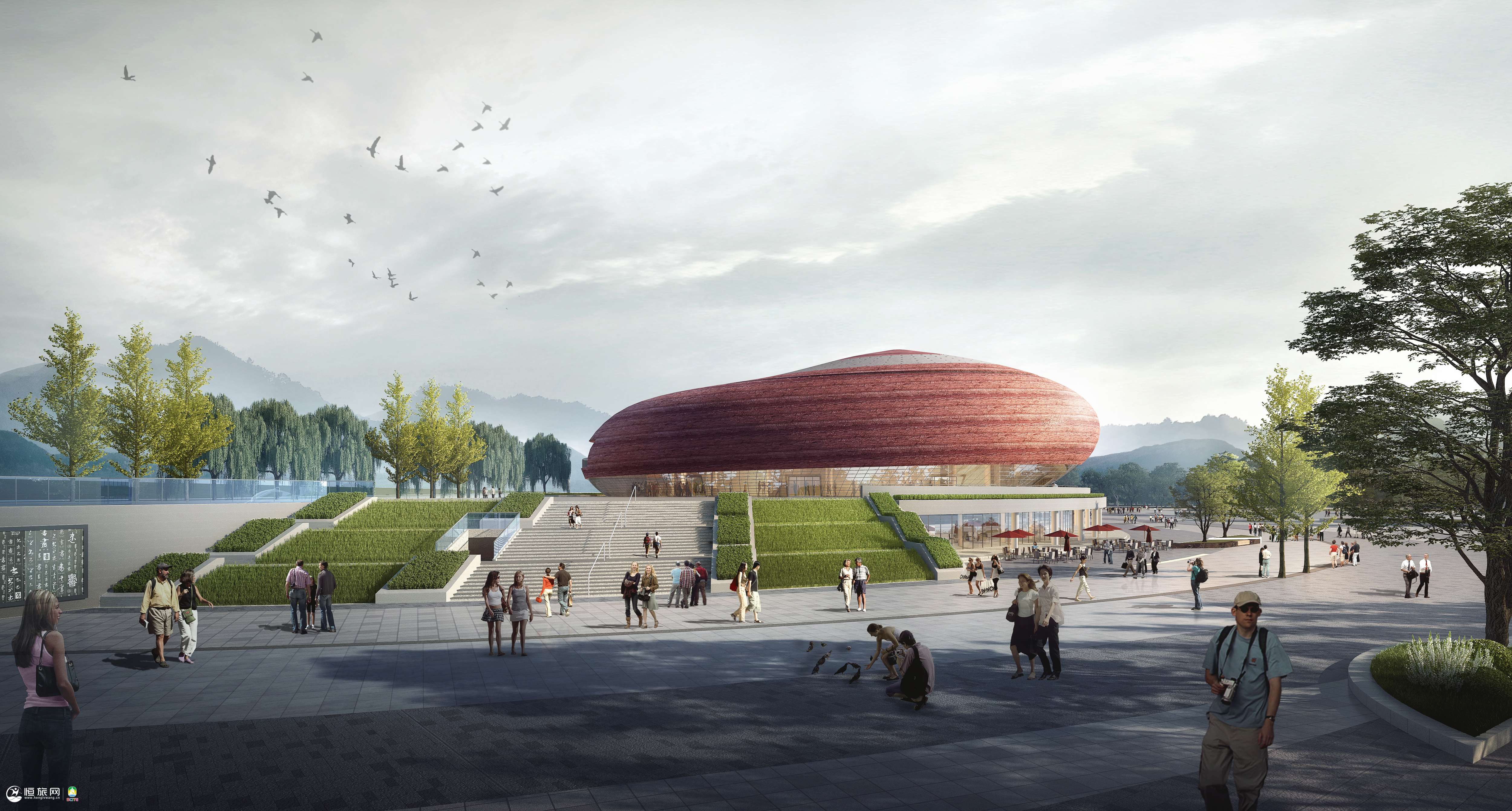 “沫若剧院”建筑总面积约9800平方米,可容纳500人,以大渡河边静躺的红色“星辰石”为设计灵感,剧院红色既代表郭沫若先生的红色精神,又象征着沫若先生创作戏剧时的无限激情,因此这个剧院也被称作“思想之石”。