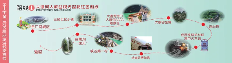 城区——“三线”记忆小镇——大渡河金口大峡谷标AAAA级景区——大峡谷坐佛——连心桥——成昆铁路关村坝洞中火车站——铁道兵博物馆——峡谷第一村——白熊沟“一线天”——返回城区