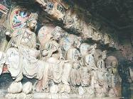 资中最有名的石刻造像,当属东岩罗汉洞。罗汉洞紧靠沱江,与成渝铁路资中火车站隔河相望。这里的《释迦拈花讲法图》摩崖造像堪称经典。