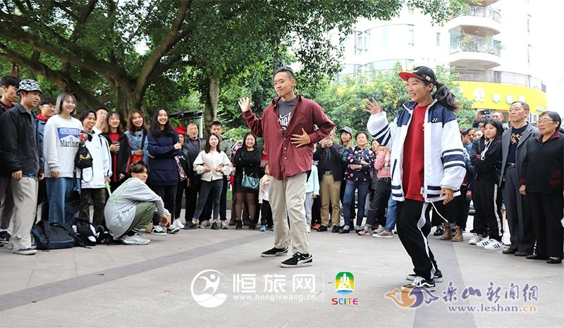 昨(3)日下午,在中心城区肖公嘴附近,一群游客市民顿时围成了一圈。原来,这里正在上演街头“尬舞”,而跳舞的人也十分特殊,是一群来自成都的大学生游客和乐山73岁的老太伍德蓉。