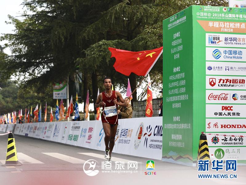 男子组半程马拉松冠军冲线瞬间。新华网王钒摄