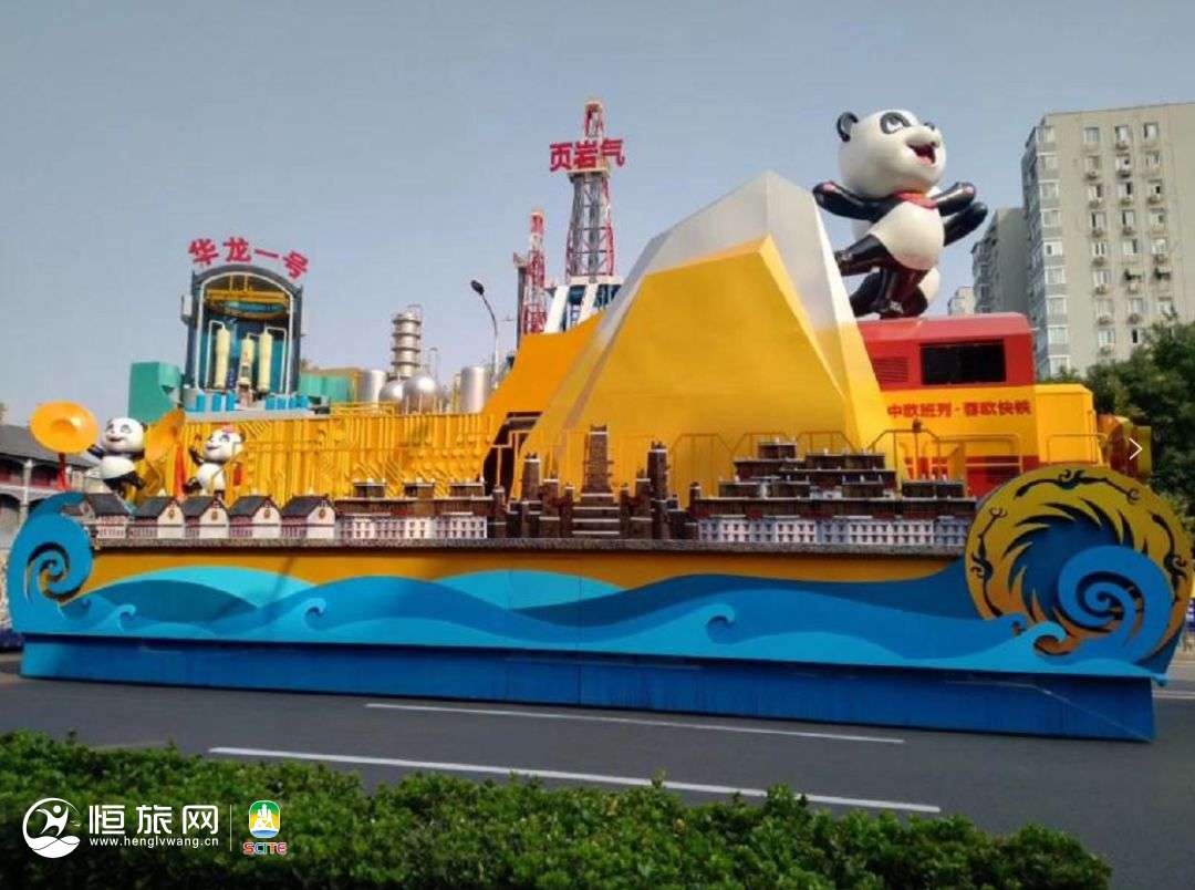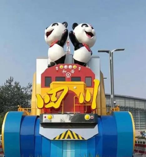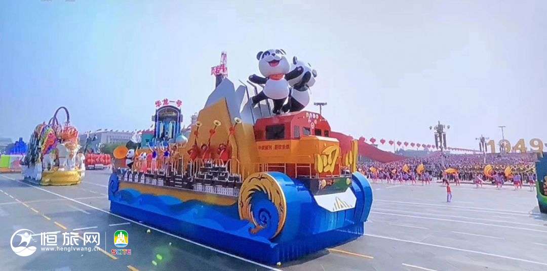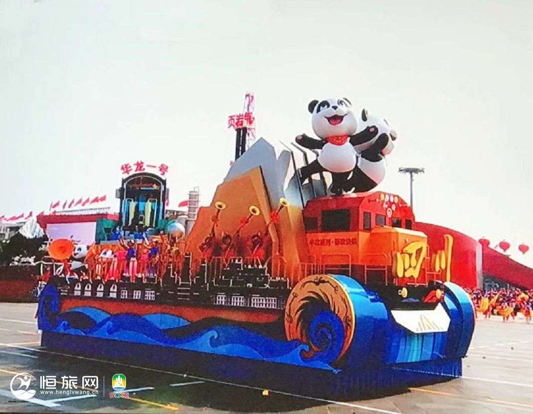 以“新时代、新天府”为主题的彩车车身长15米,宽6米,高9.16米左右,汇聚了大熊猫、金山银山、中欧班列(蓉欧快铁)、金沙太阳神鸟、灾后重建的藏羌彝汉天府新民居等四川符号。
