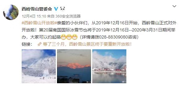 成都西岭雪山第20届南国国际冰雪节将于12月16日正式启幕。12月24日将在西岭雪山景区举行隆重的开幕仪式。