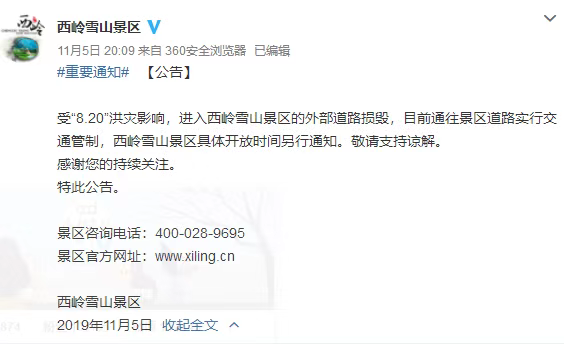 但是,需要注意了,11月5日西岭雪山景区官方微博发布消息,受“8.20”洪灾影响,进入西岭雪山景区的外部道路损毁,目前通往景区道路实行交通管制,西岭雪山景区具体开放时间另行通知。