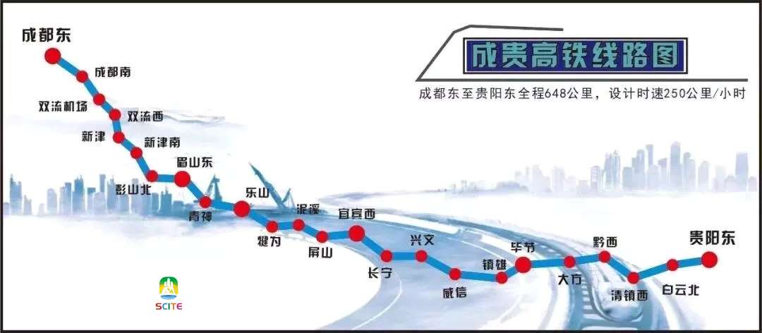 成贵高铁起于四川省成都市,途经眉山市、乐山市、宜宾市,云南省昭通市威信县、镇雄县,以及贵州省毕节市,终至贵阳市。设计时速250公里,最快2小时58分可实现两地通达。其中,成都至乐山段已于2014年底开通运营,乐山至宜宾段2019年6月开通运营。