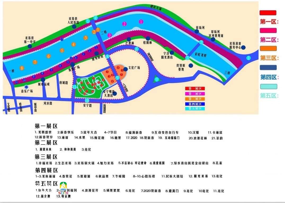主要布展区域为:安宁河一桥至颛顼龙桥之间水面,县城文化广场南北广场,县城易园,安宁河两岸滨河长廊等地,共有陆地大型灯组、水面大型灯组、小品灯组40多组。