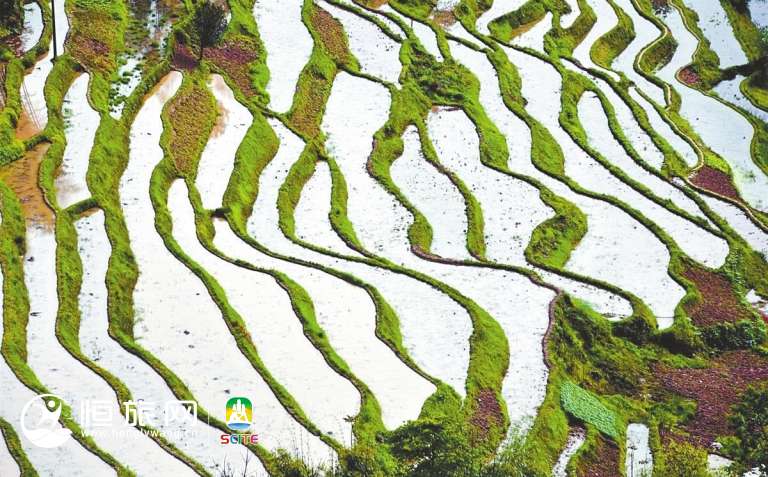 素有“川南小峨眉”之称的叙永县丹山风景区脚下的万亩梯田,以连绵不绝的丹霞地貌和喀斯特岩溶地貌著称于世,成片的梯田随着山体沟壑舒展起伏,伴随点缀其间错落有致的川南民居,如层层波浪漫卷开来,尽显蜀地的壮美风姿,吸引了众多游客。
