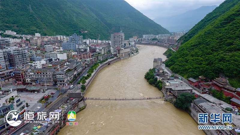 横跨在大渡河上的泸定桥(2019年7月27日无人机拍摄)。(王曦 摄)