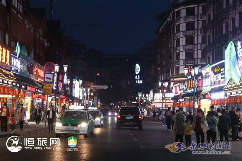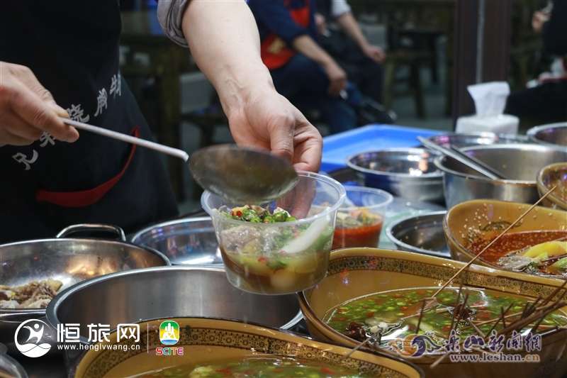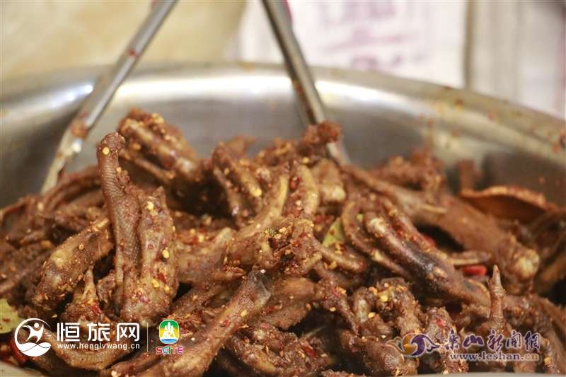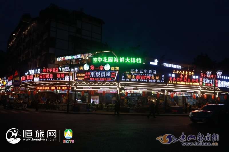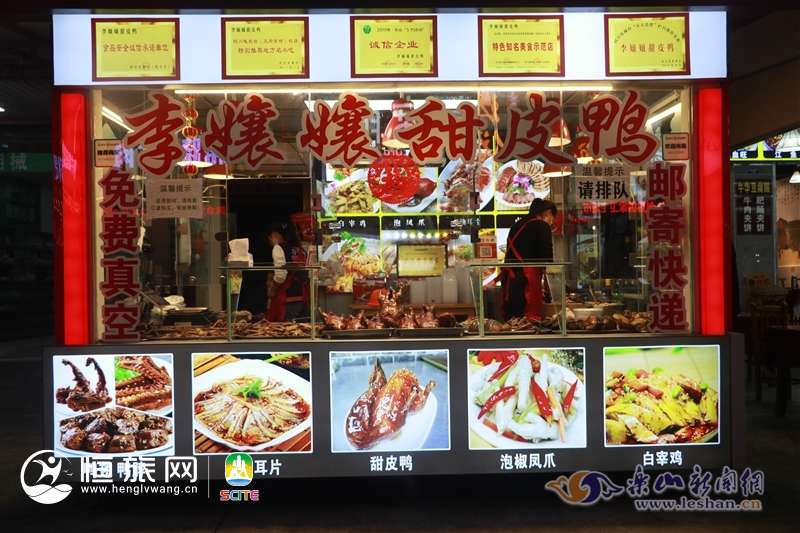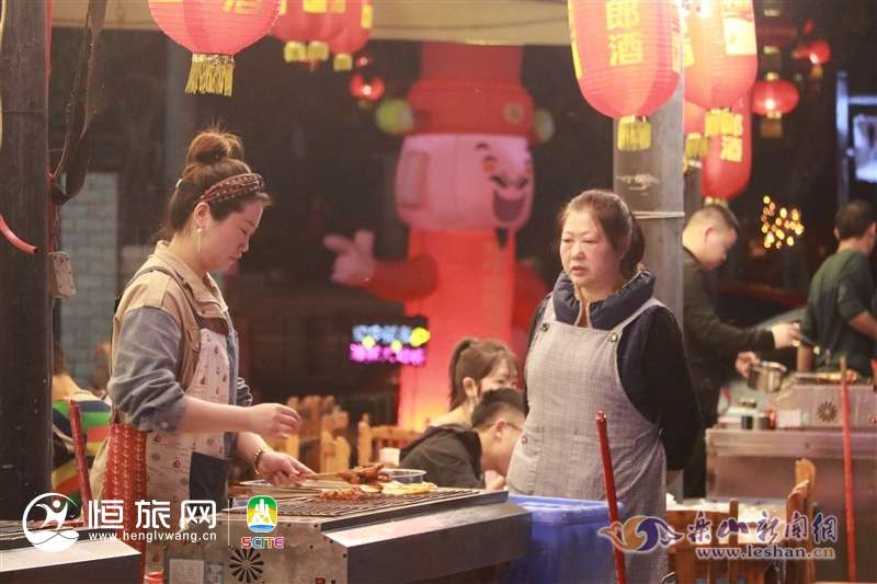 行走在灯光耀眼的好吃街上,扑鼻而来的是各种熟悉的乐山味道,甜皮鸭、钵钵鸡、翘脚牛肉……