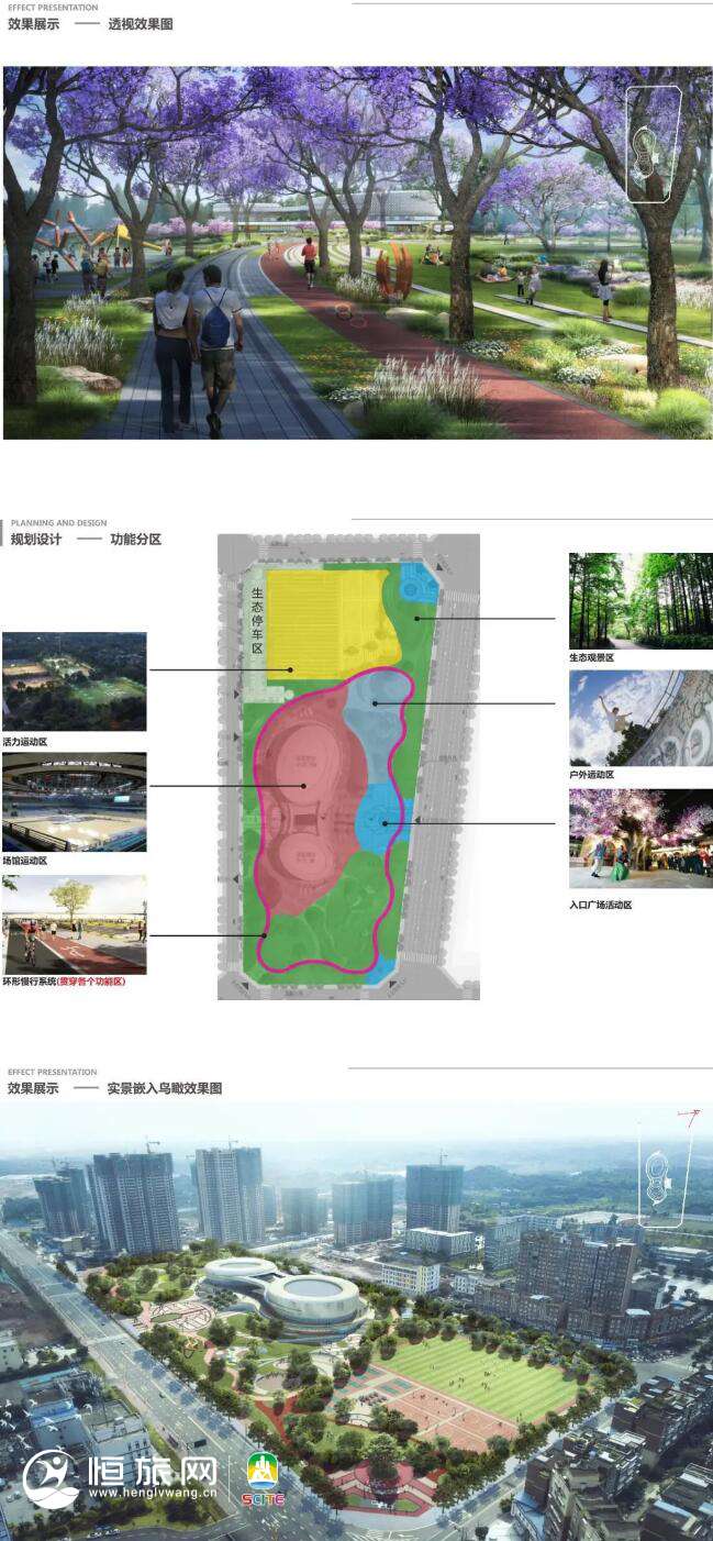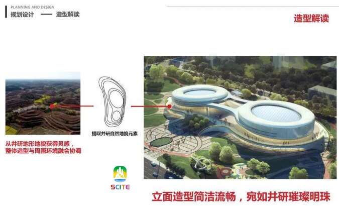 项目整体规划以“绿秀井研”为底,融入井研自然地貌元素和千年“盐”文化,打造全民共享、全民参与的多功能综合体育场馆和新区中央公园。整个项目绿地率达到45%。