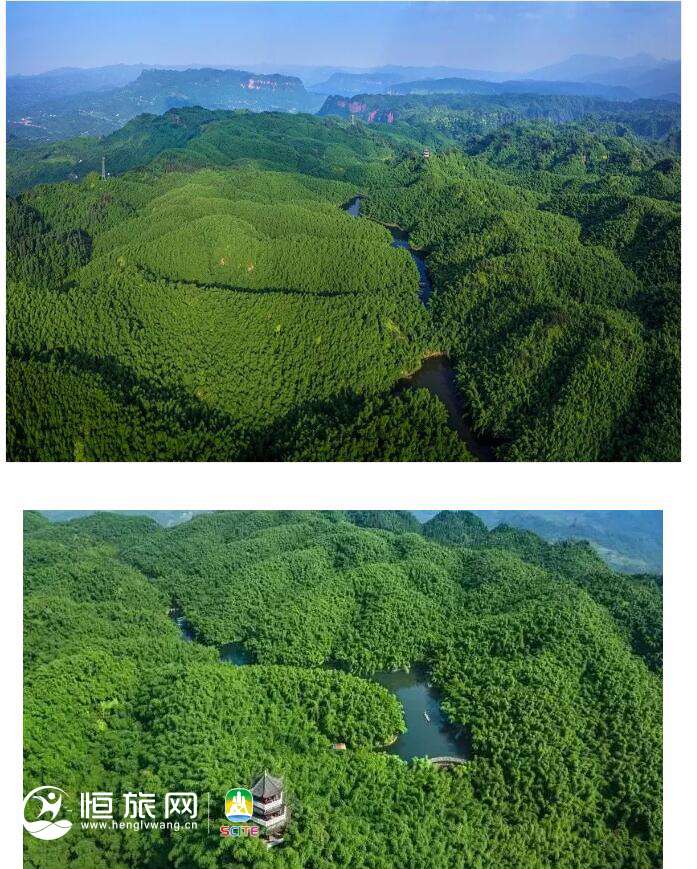 沐川竹海景区:位于沐川县城东南方,地属丹霞地貌,平均海拔 450 米,中心旅游区林竹面积10余平方公里,核心景区负氧离子含量达到35000个/㎝3。绵延起伏的山峦河谷间有成片慈竹10万余亩,微风吹拂,绿波荡漾,逶迤成浪,一望无涯,故得竹海之名。有天造地设的"萧洞飞虹",曲折惊险的"穿洞子九沱十八滩",山水合一的永兴湖,归隐山峦的永兴寺,神秘险要的桃源洞等自然人文景观。