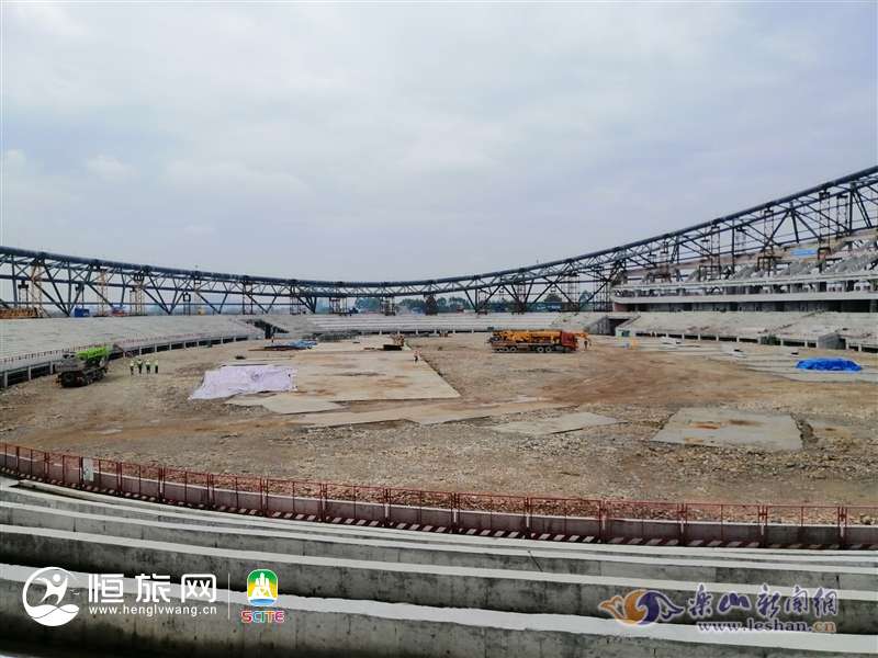 据项目总工程师董万龙介绍,目前乐山奥体中心项目主体结构、钢结构已经施工完成,正在进行机电安装、幕墙安装、金属屋面施工,砌体、抹灰等初装修工作已完成80%。