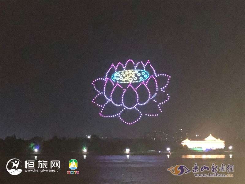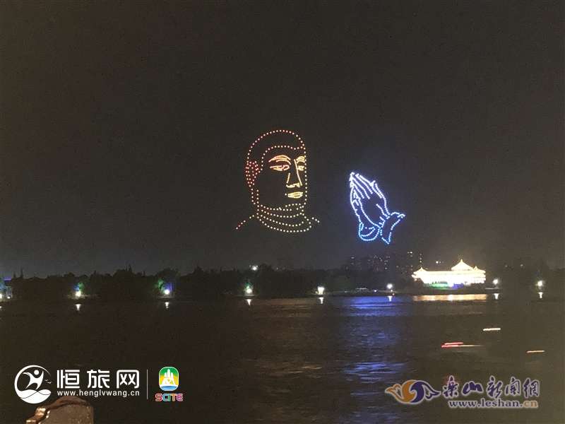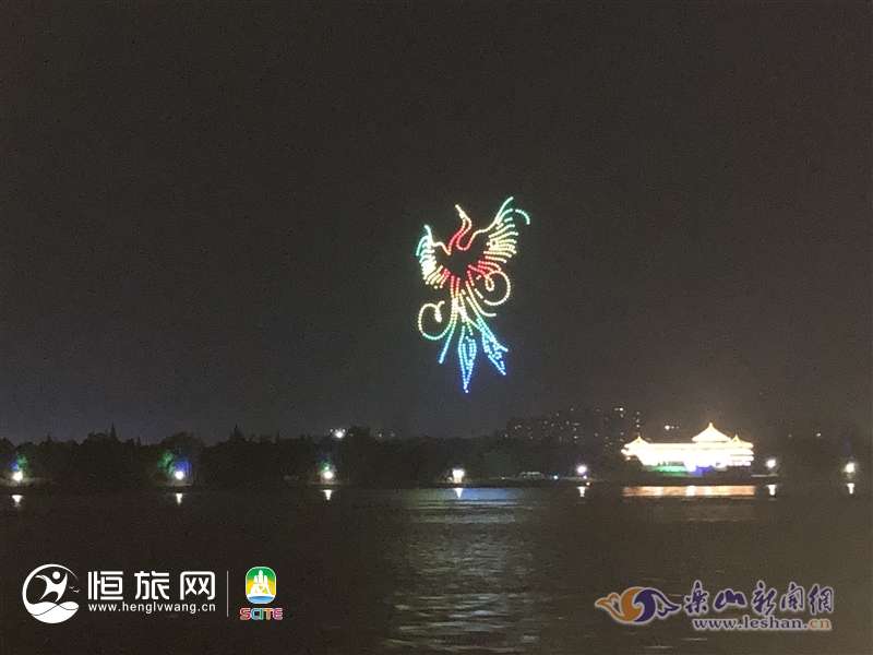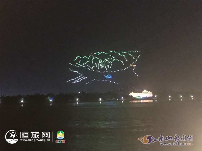 晚上8点40分,在工作人员的指挥下,600架无人机从凤洲岛起飞,飞上高空。依次摆出乐山欢迎你、峨眉金顶、乐山大佛、乐山睡佛、凤凰涅槃、巨型莲花等等造型。在蒙蒙秋雨的承托下,显得煞是好看。