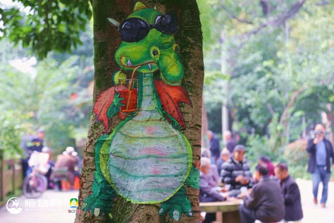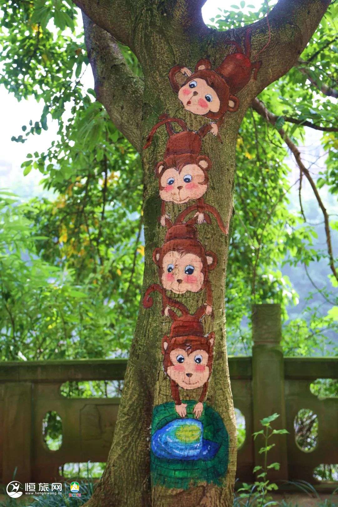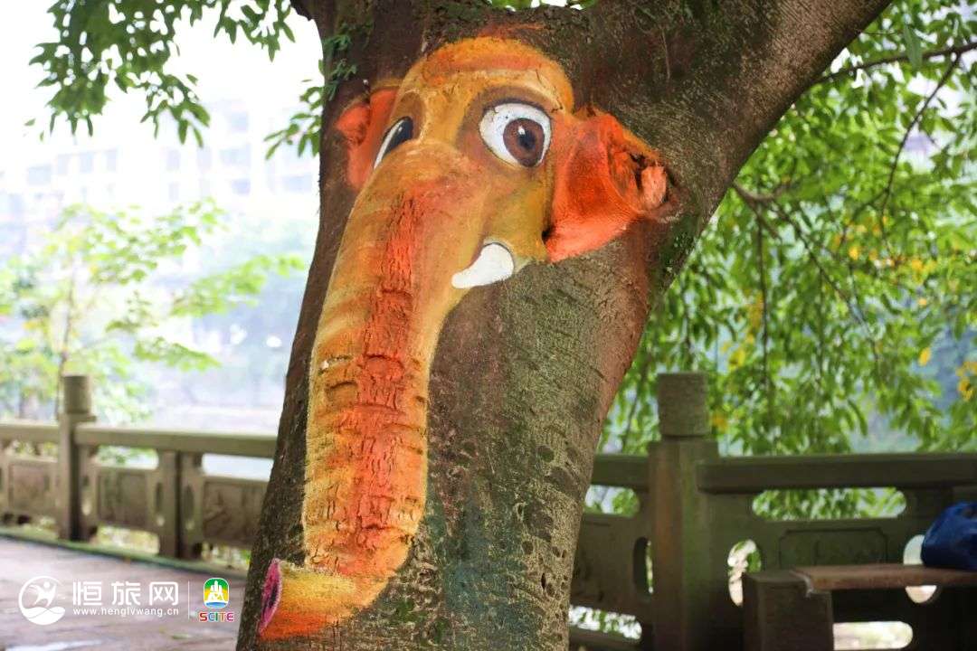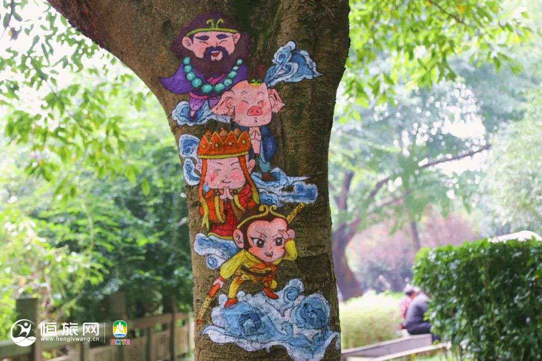 据参与树画的画师陈丽介绍,在树上画画可不是一个简单的活儿,首先要选择能画画的树,被选中的树,树干要有一定的宽度,还要根据树木生长的形状确定具体绘制的卡通形象,要能与树木巧妙地融为一体。
