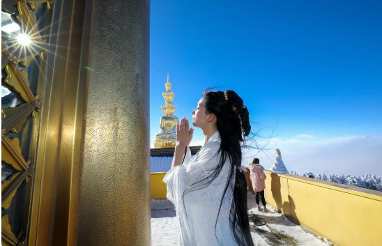 金色普贤和殿宇的交相辉映,配上温婉气质的汉服小姐姐,这样的加分项实属于冬天一抹惊鸿,一下子就将峨眉山装扮得仙气袅袅。