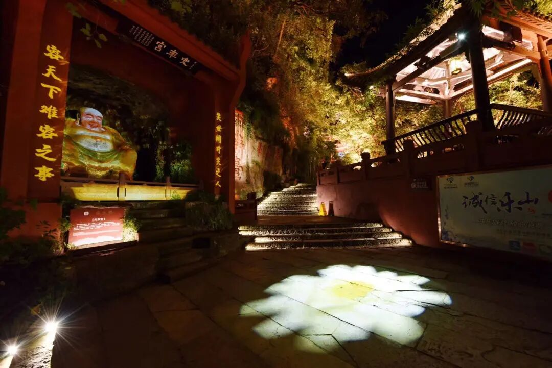 去凌云山,从山脚开始,蔓延到山顶,那并不刺眼的,恰到好处的灯光在角落里绽放,把夜变得五光十色,石阶与墙壁多了一丝神秘与古意,踏入山道,全然没有白天的急迫,一步一阶,一步一思,禅语不言,灯自引路,佛韵初现。