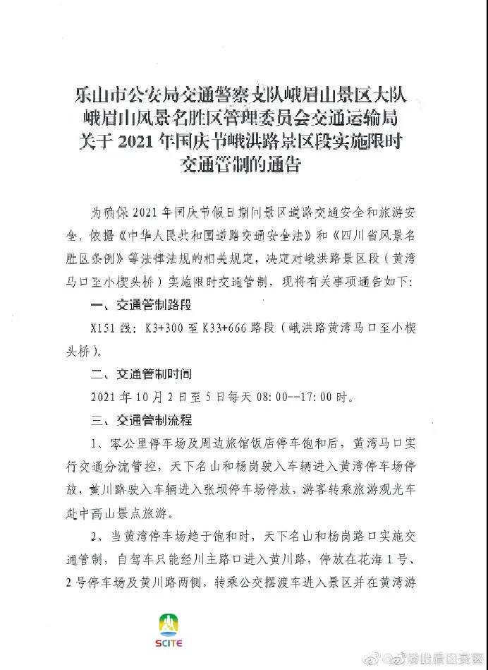 即日起至10月5日,峨洪路景区段实施限时交通管制。