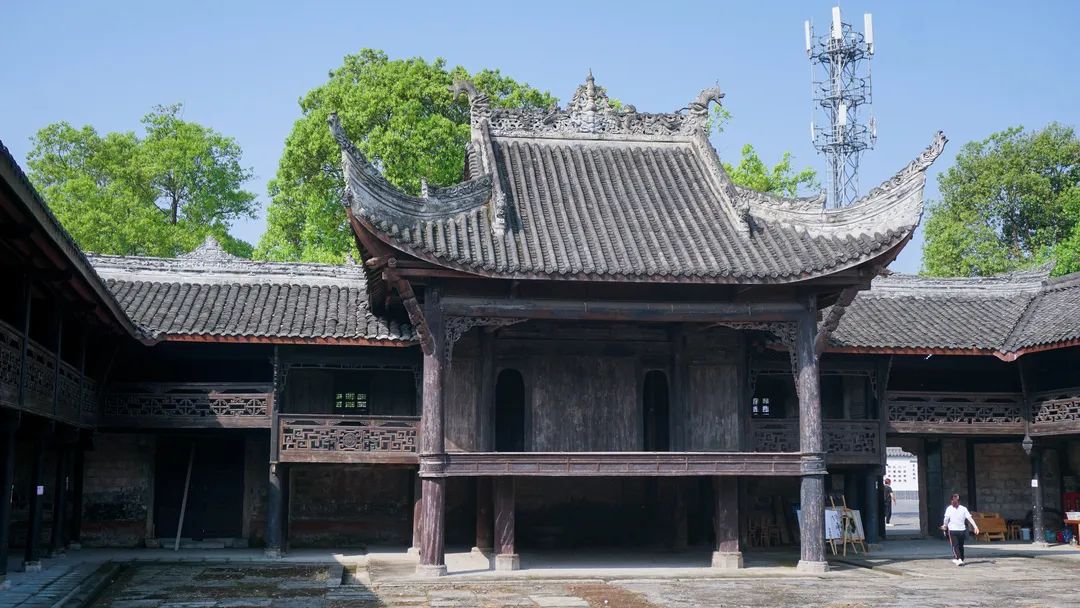 祠堂建筑整体外观较为简朴,在阳光下,祠堂内部的戏楼翘角飞檐、老屋青瓦,显示出古老恢弘的气势。