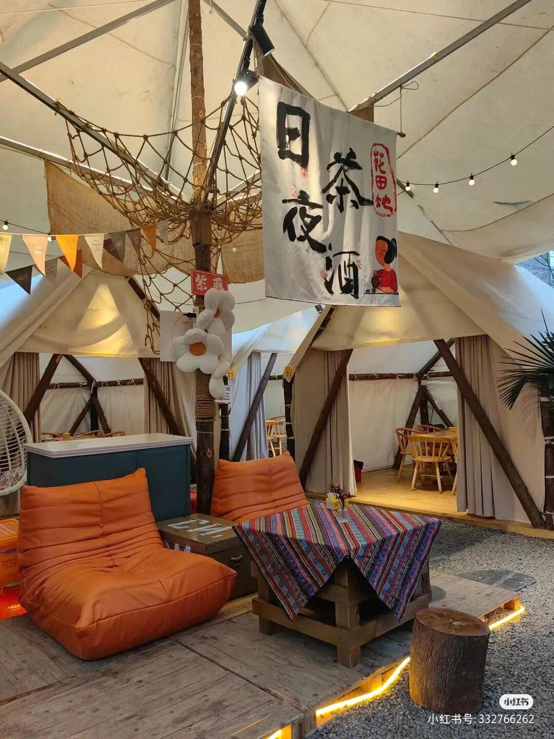 下午,可以坐在帐篷里,伴着亮堂的阳光,和三五好友一起闲坐、品茶,聊聊家长里短,简直不要太舒服~