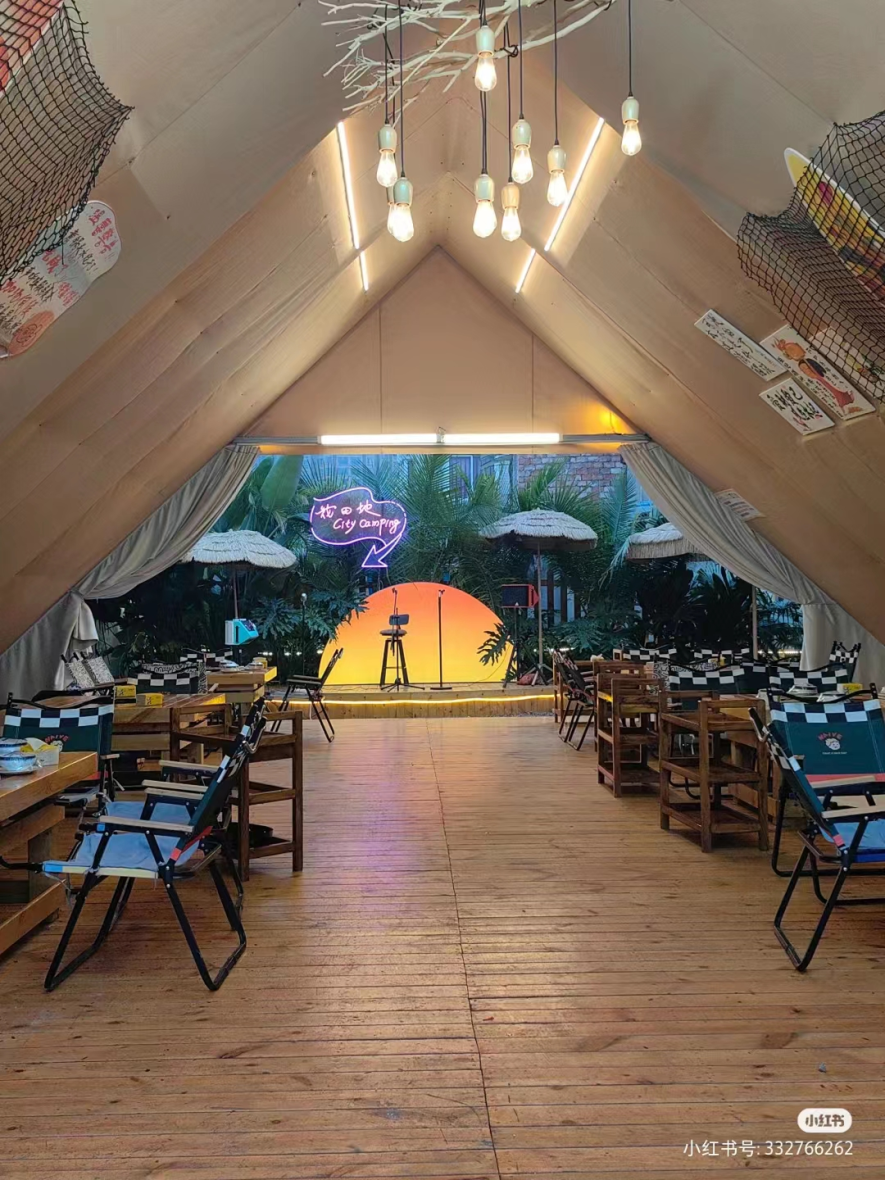 就在市中区世豪广场,是一家户外露营+室内酒吧相结合的店。