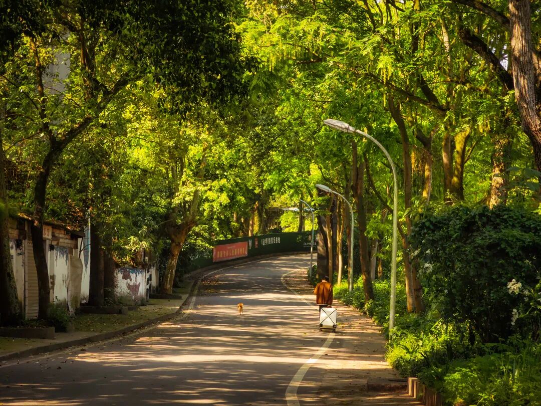 一步步走在其中,你会遇到生机无限的高大树木、穿过枝叶洒在路上的光斑、在风中摇曳的树叶、蜿蜒的石阶和三三两两朝拜的人......