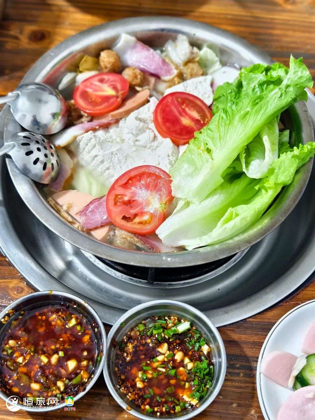 不论荤素,菜品都很丰富,荤菜有酥肉、丸子、白肉、午餐肉等!蘸碟加了小米辣,又辣又香超下饭!分量也很足,三个人点个小锅刚刚好~他们家的鱼也不错哟~