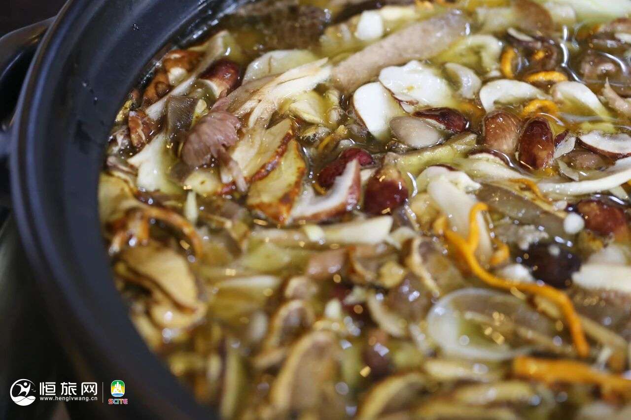 菌子来源于云南高原,口味更鲜、口感更好。各种菌子倒入石锅中,搭配熬制好的土鸡原汤慢慢烹煮,大约20多分钟,菌子的鲜香与鸡汤的浓郁完全融合,鲜美醇厚,只需一口汤汁,就能让人心旷神怡。