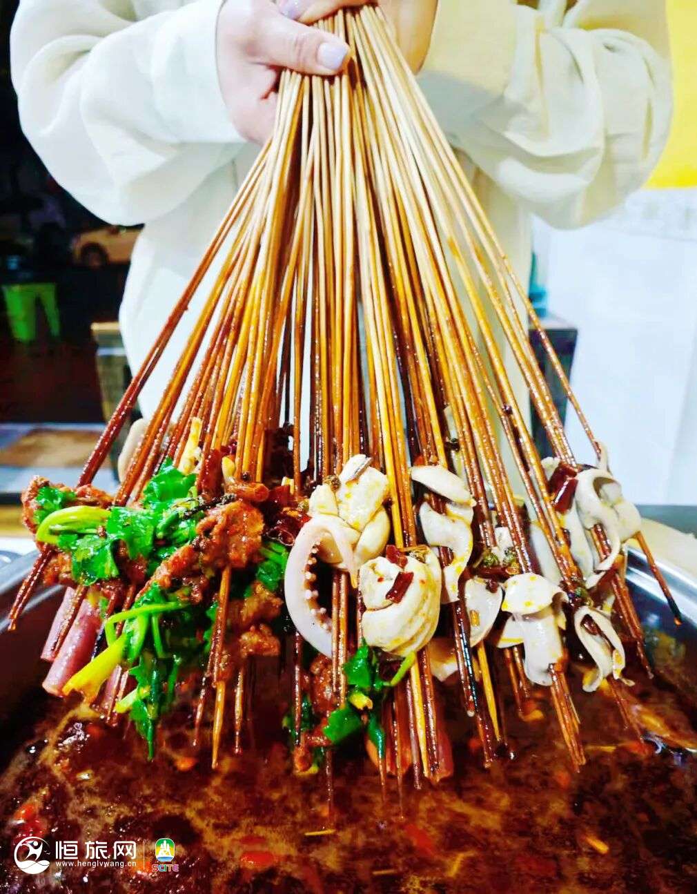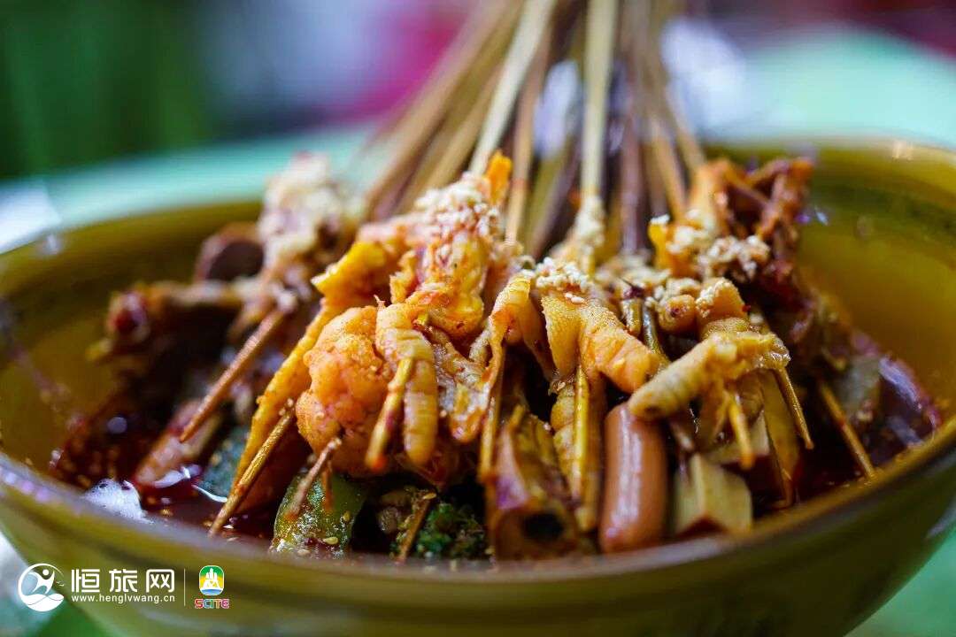 味道层次丰富,食材五花八门,在色泽浓郁的汤底中,放入穿在竹签上的麻辣牛肉、麻辣排骨、小郡肝等食材,边吃边烫,再配上秘制的蘸碟,根本停不下来!