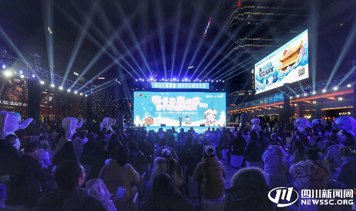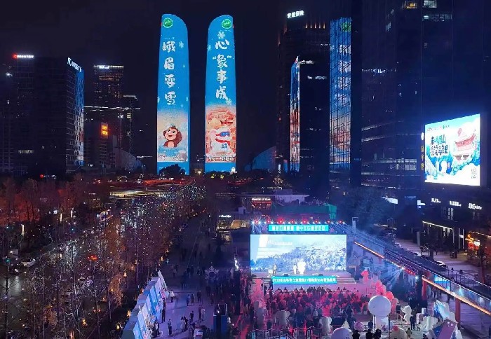 当晚,218米高的双子塔上演灯光秀。其以动态光影为载体,呈现峨眉山巍峨山形、氤氲温泉、萌趣福象、灵动灵猴及纷飞雪景等核心文旅元素。