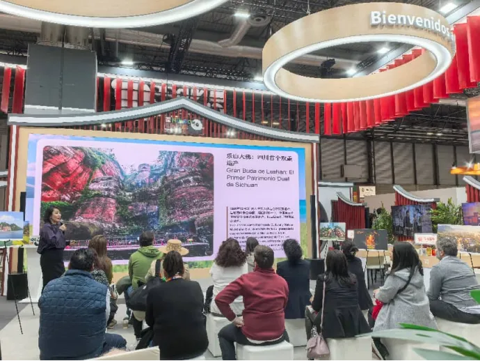 展会期间,乐山大佛景区展位以文化融合自然的设计理念,生动呈现乐山大佛作为世界文化与自然双重遗产的独特魅力。面向欧洲旅行商与游客,景区重点推介了“大佛+都江堰+九寨沟”世界遗产联动线路,串联川西南山水风光与千年佛教文化,满足欧洲游客对深度文化体验与自然观光的需求。四川国旅同步发布多条针对欧洲市场定制的精品线路,涵盖文化探秘、民俗体验、美食寻味等多重维度,提供个性化行程选择。