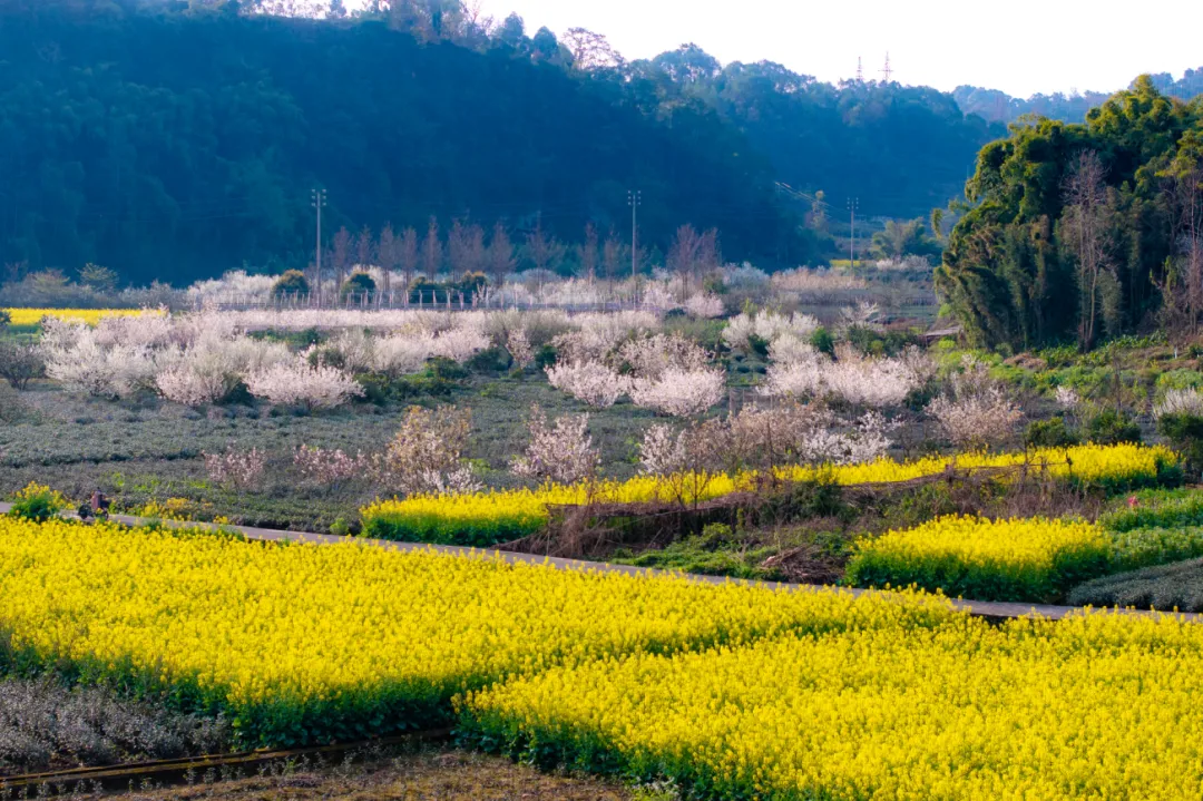 油菜花铺开一地金黄,李花堆起满树雪白,樱花点缀其间,或粉或红——这片土地像是被春天打翻了调色盘,绚烂得不讲道理。