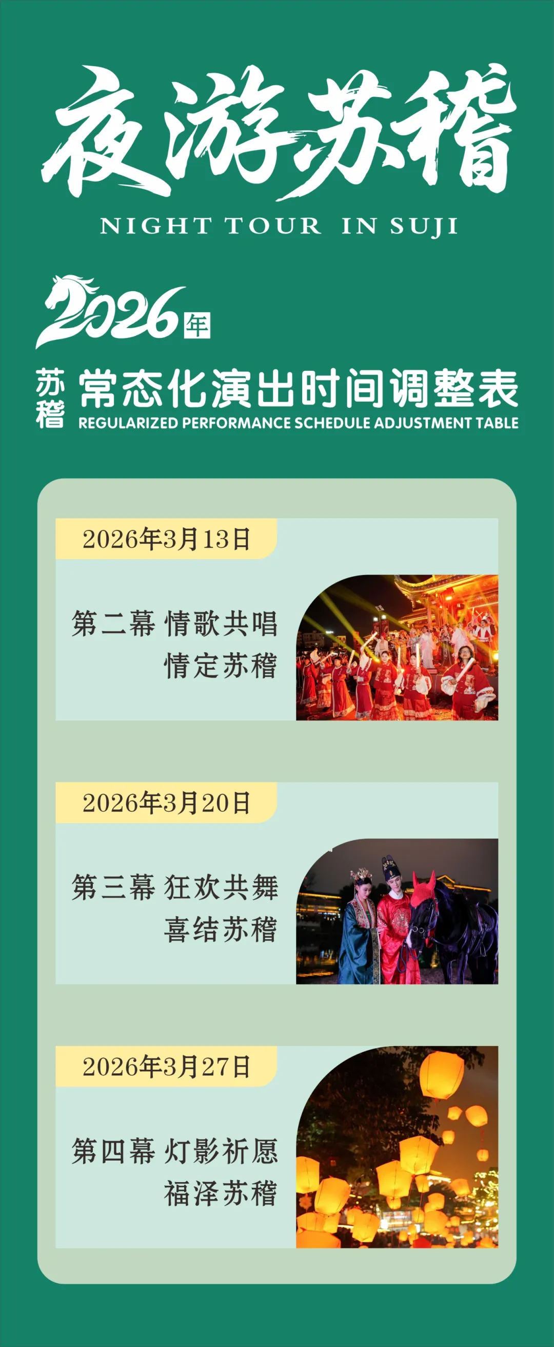 为优化游览体验、保障现场秩序,现对夜游苏稽常态化演出后续三场时间及内容调整如下: