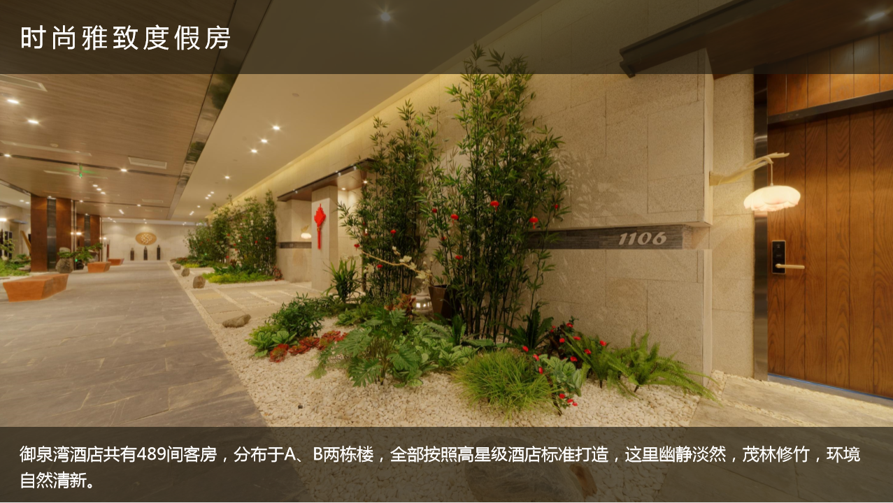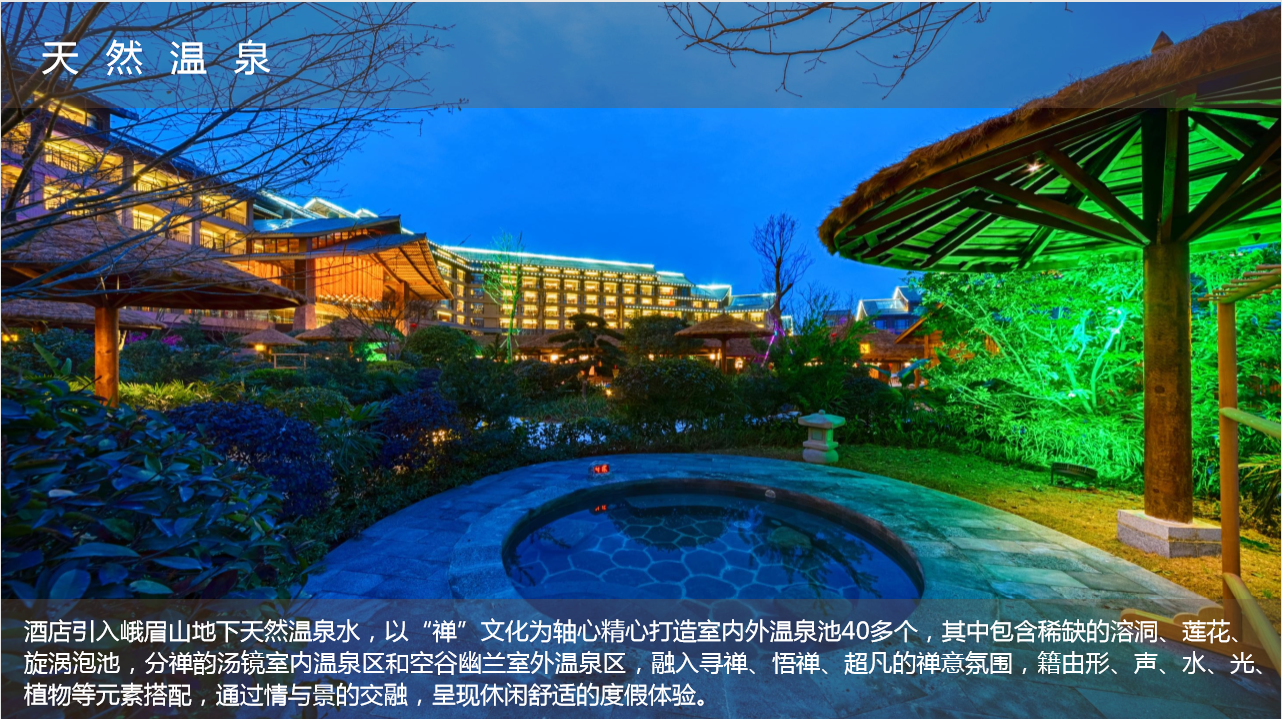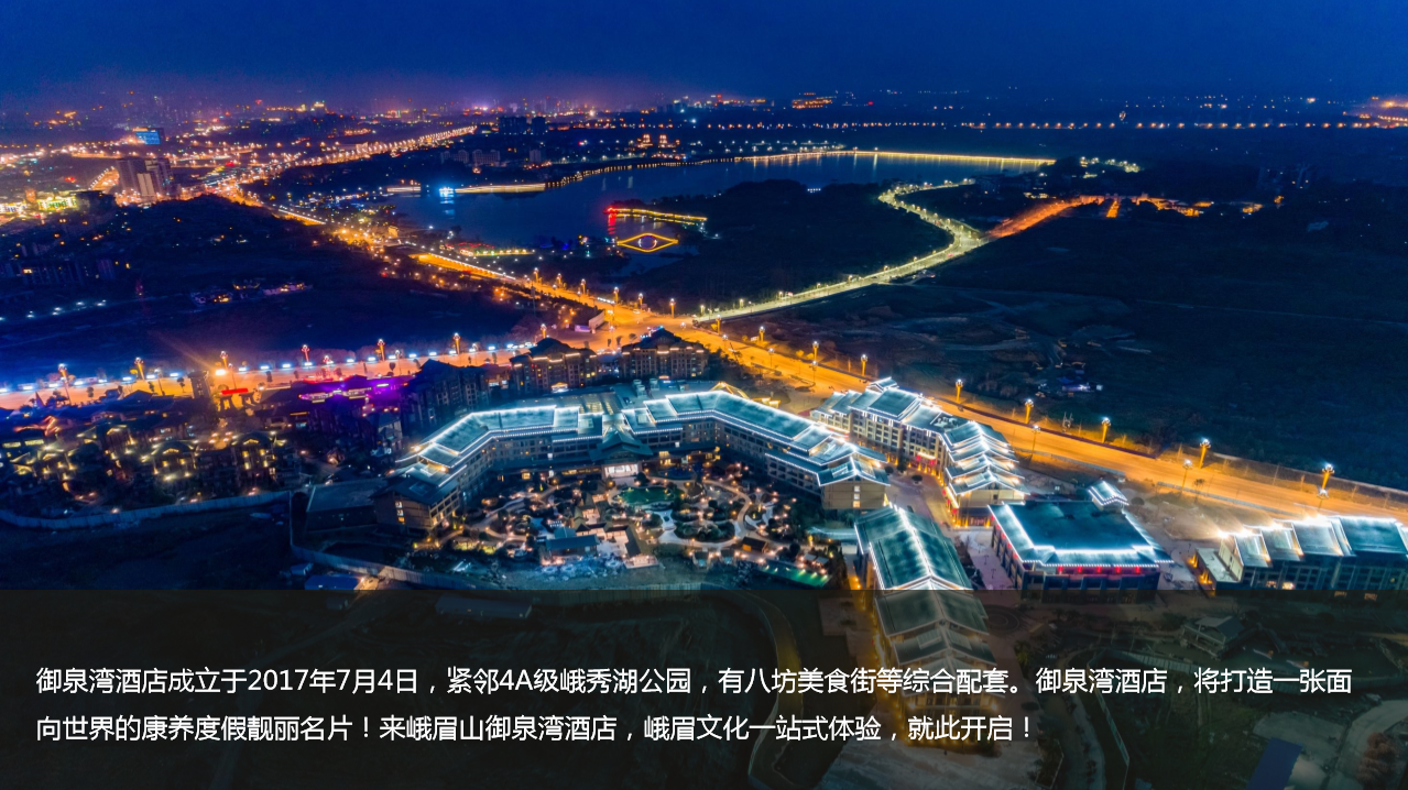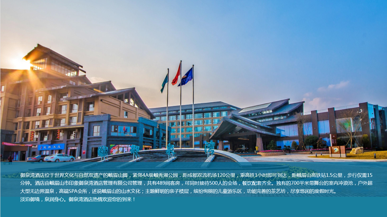 峨眉山御泉湾温泉酒店,位于世界文化与自然双遗产的峨眉山脚,紧邻4A级峨秀湖公园,距成都双流机场120公里,乘高铁1小时即可到达,距峨眉山高铁站1.5公里,步行仅需15分钟。独有的700平米带舞台的室内冲浪池,户外超大型无边界温泉,高端SPA会所,述说峨眉山的山水文化;主题鲜明的亲子楼层,缤纷绚丽 的儿童游乐区,功能完善的茶艺坊,尽享悠闲的度假时光。 澹泊御境,泉润身心。御泉湾酒店热情欢迎您的到来!