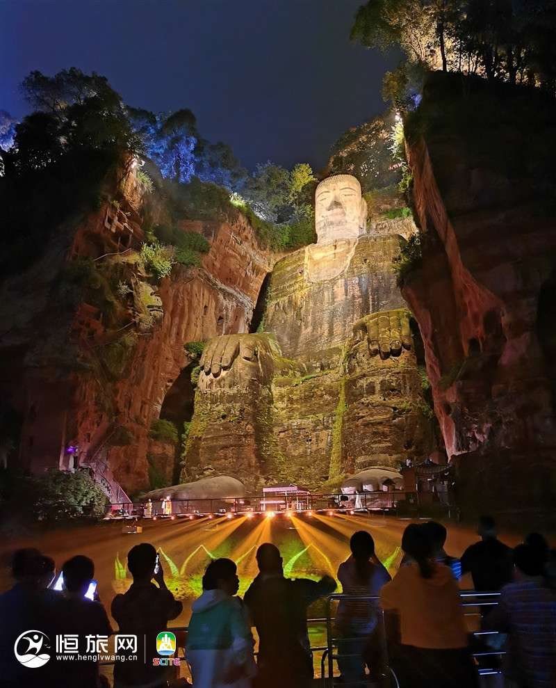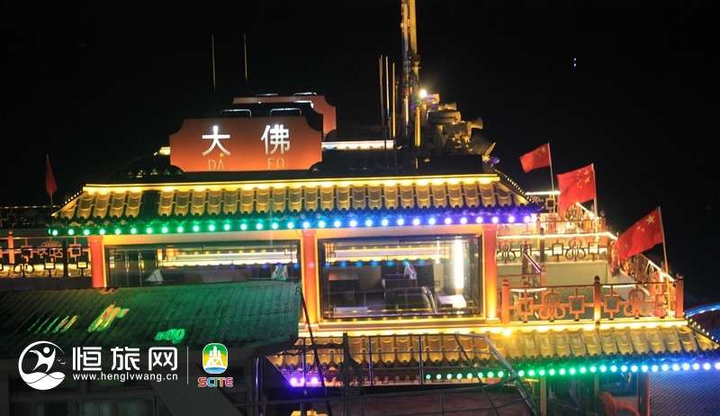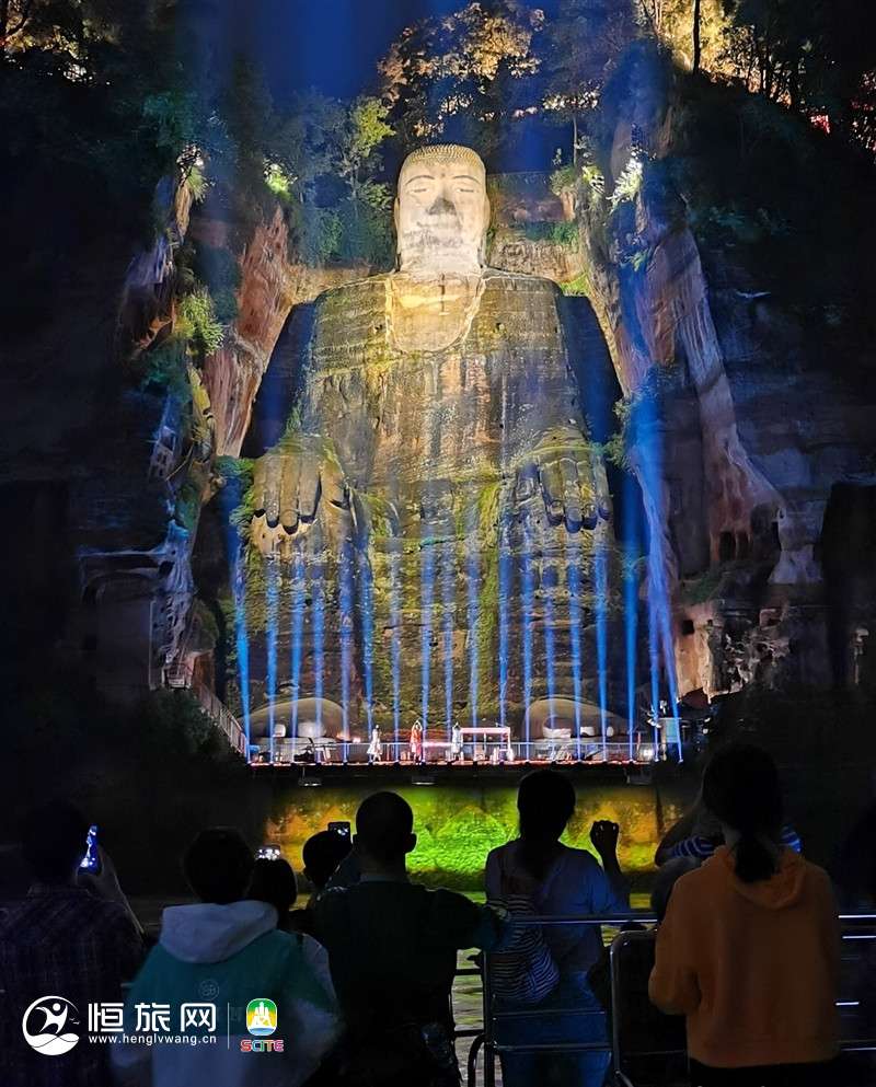 船上,一面面五星红旗伴着悠扬的古韵声迎风飘扬,在夜色中分外耀眼。游船行进到大佛脚下,通过现代光影技术演绎的大佛建造故事,让游客直观地了解乐山大佛的建造史。游船停靠在观佛楼,随着五色变幻,睡佛的轮廓越发清晰,梵音婆娑中宛若初醒。而位于睡佛心脏部位的千年大佛,则仿佛披上了一件光影织就的五色“袈裟”。