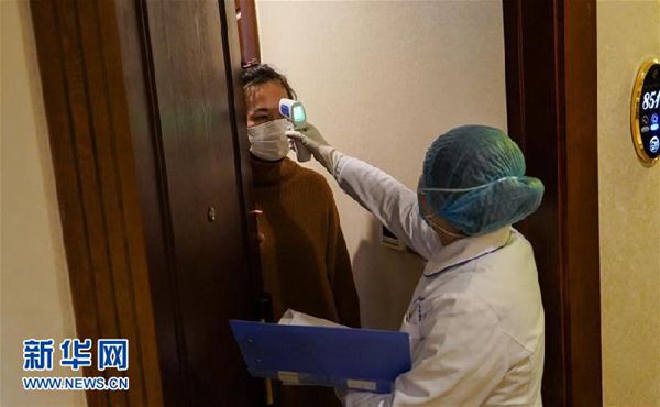 2月1日,医护人员为一名当日结束医学观察的武汉滞留旅客检测体温。张超群 摄