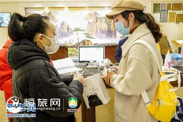 2月1日,工作人员向一名结束医学观察即将离开的外地旅客(右)送上口罩、酒精喷剂和熊猫玩偶等伴手礼。新华社记者 张超群 摄