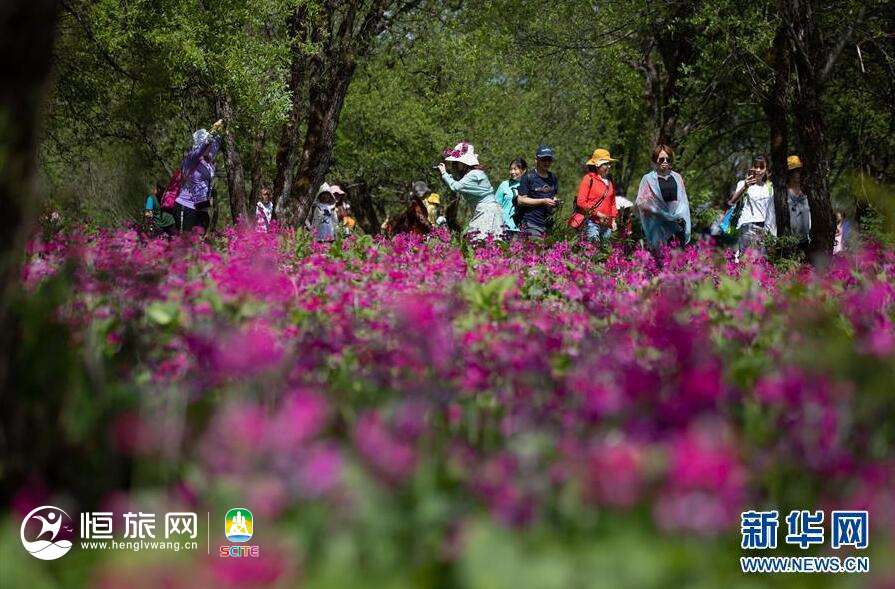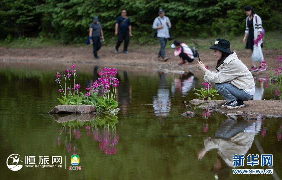 5月24日,游客在四川省汉源县桌子山上观赏报春花。新华社记者 江宏景 摄