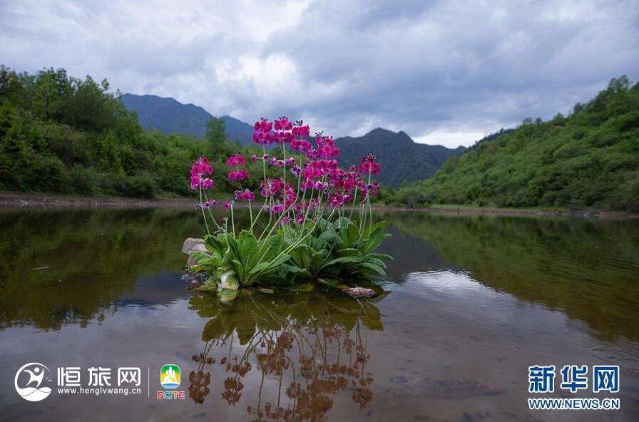 在四川省汉源县桌子山,几株报春花生长在水中(5月24日摄)。 新华社记者 江宏景 摄