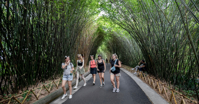 成都大熊猫繁育研究基地(以下简称熊猫基地)阳光正盛,遮阳伞、防晒衫、随身携带的小风扇以及墨镜等随处可见。在一处大熊猫室外活动场的树上,温度计显示室外温度已经达到了32℃。这么热的天,大多数人都会选择空调“续命”,大熊猫呢?