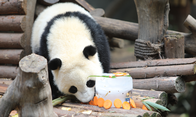 空调房是大熊猫愉快度夏的主要方式。同时基地也为它们准备冰蛋糕等消夏食物,既丰容,也可以让它们凉快一下。以防万一,空调出现故障的时候,基地会给熊猫提供大块的食用冰。对人来说太冷了,但对它们来说刚合适,很凉快,有的会趴在上面睡觉。