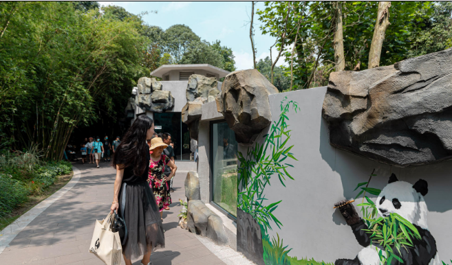 另外除了室外本来的水池,饲养员也会给大熊猫喷水洗澡降温。另外基地室外活动场,还配有雾森系统。在树林灌木等形成的阴影中,喷淋水雾,可以稍微降低环境温度。